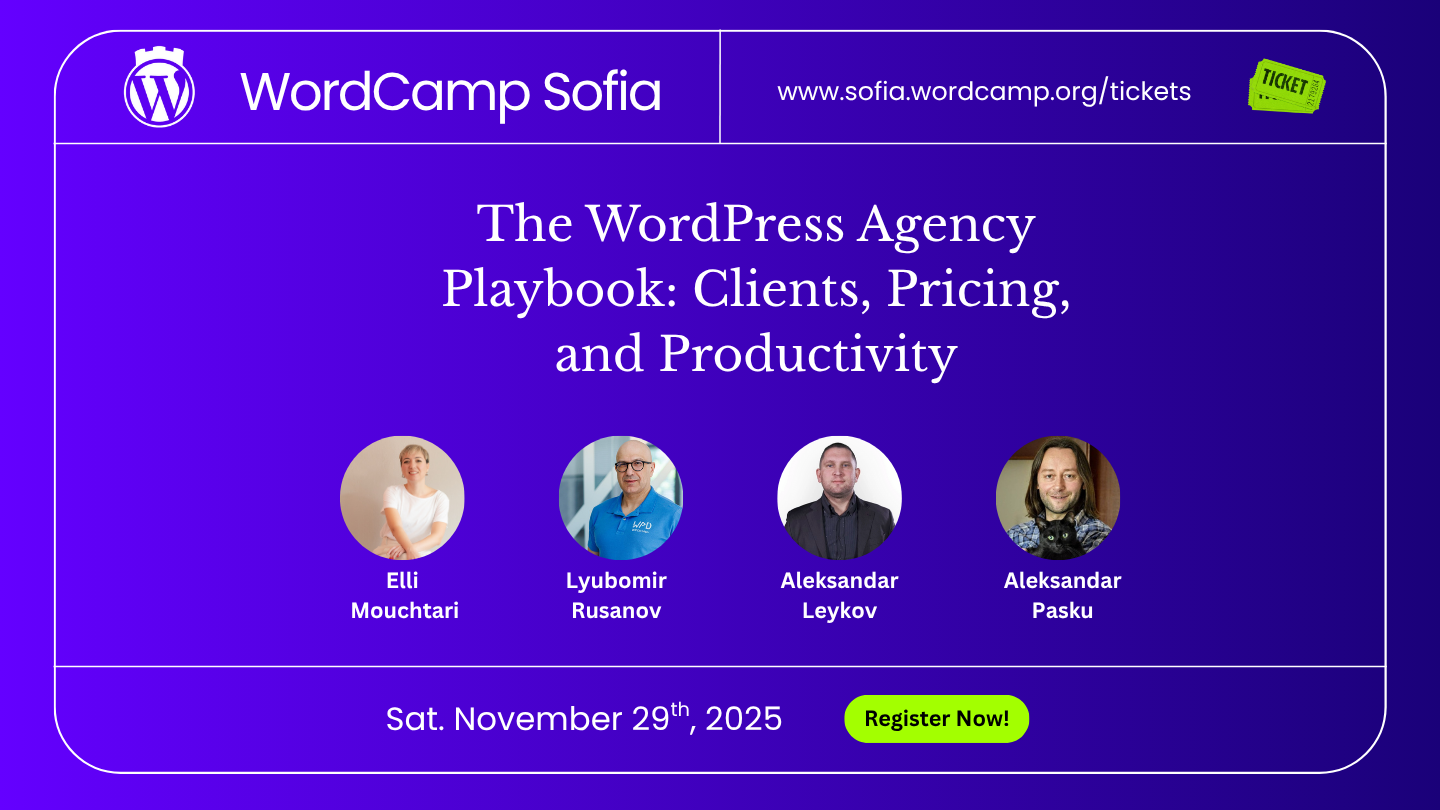 🇧🇬 Спираме се на темата, защото успешният WordPress бизнес не се гради само с добър код – нужни са ясна стратегия, ефективна комуникация и фокус върху реалната стойност на работата. Тези четири сесии ще ви покажат как да привличате правилните клиенти, как да оценявате своя бизнес и как да поддържате баланс между креативност и продуктивност.