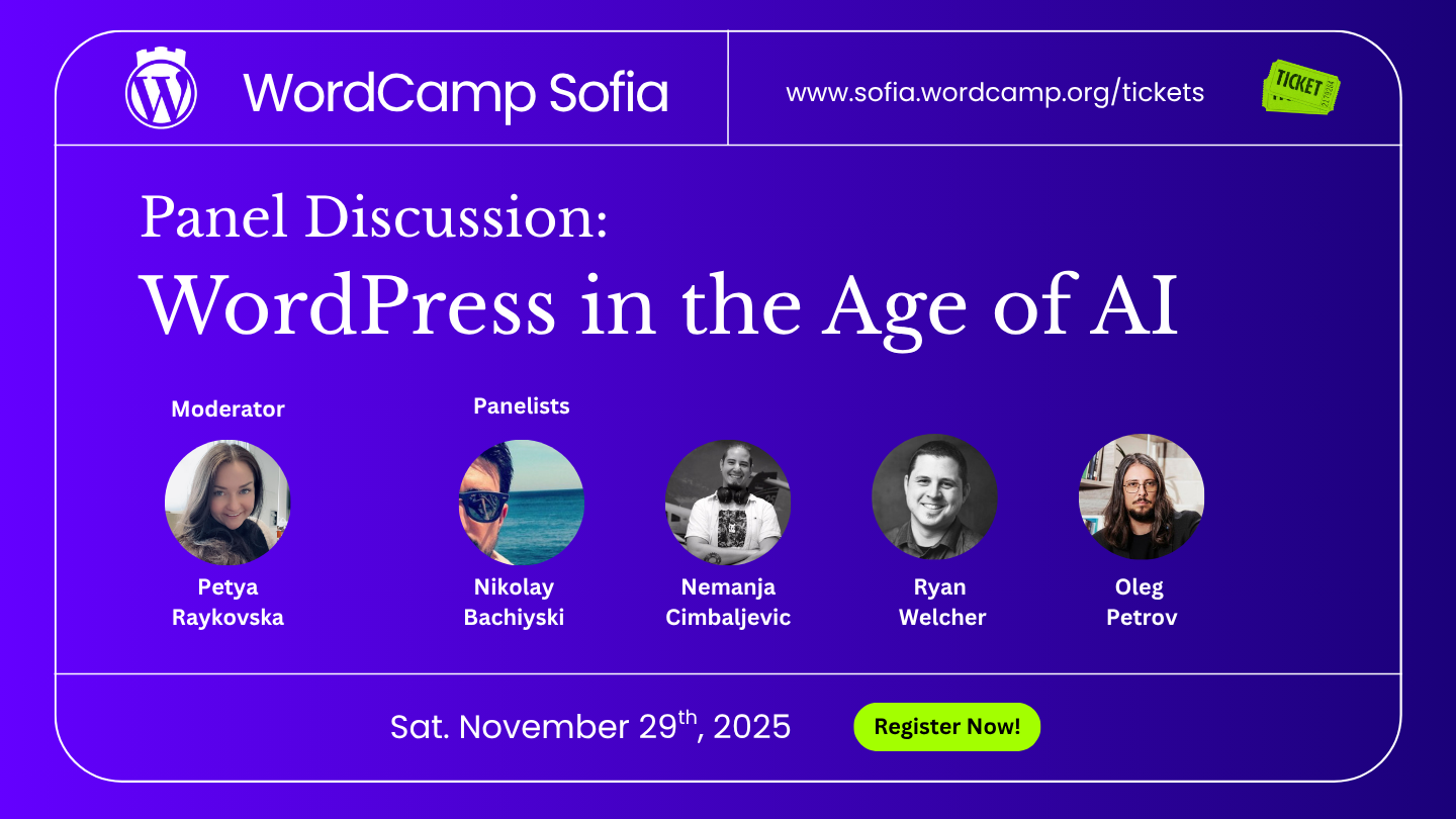 AI не е просто тренд, a вече оформя начина, по който създаваме съдържание, управляваме сайтове и изграждаме потребителски преживявания в WordPress. Този панел събира водещи WordPress експерти, които ще споделят реални наблюдения, опит и прогнози за бъдещето.